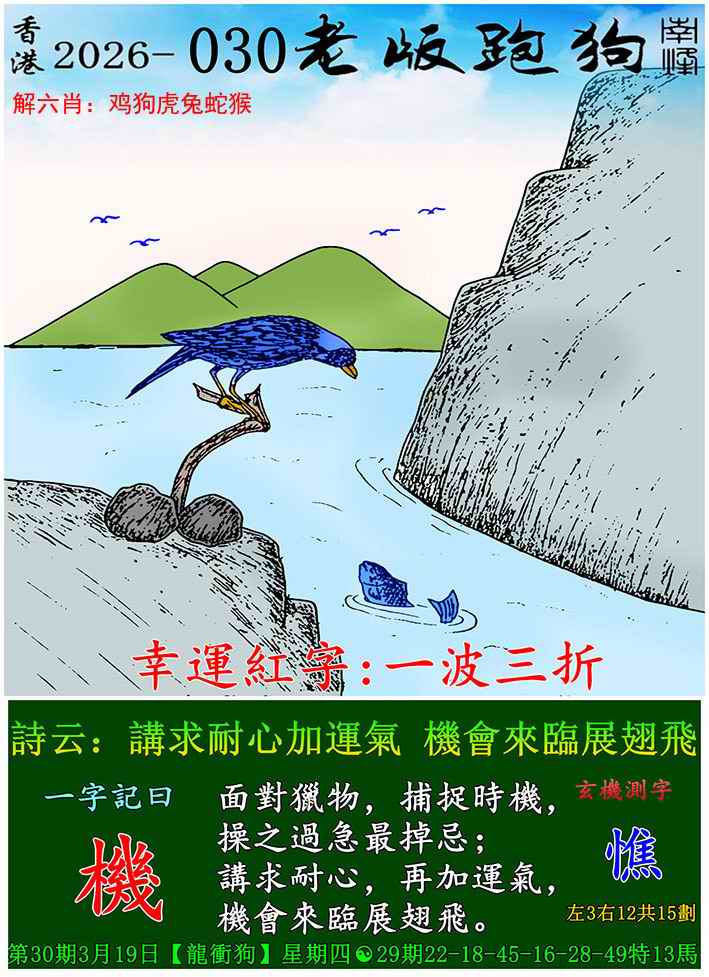 030期:一字記之曰:【機】詩雲:講求耐心加運氣,機會來臨展翅飛。面對獵物,捕捉時機,操之過急最掉忌;